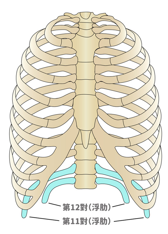 人體共有十二對肋骨。其中第一到第十對肋骨,從背部發出後,往前彼此相互連結於胸骨,構成桶狀的胸腔外型。而第十一,第十二對肋骨則不同,自背部發出後,並未與其他肋骨連接,也不構成胸腔的輪廓,它們各自游離,因此稱為“浮肋”。