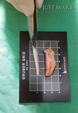 自體真皮組織來自股溝附近的真皮,真皮層夠厚,取皮區域經縫合後,一到三個月疤痕消失,幾乎是一個隱形傷口。疼痛度幾乎是零,厚實的真皮層提供隆鼻者高挺的山根鼻樑,飽滿的鼻頭鼻珠,卻沒有人工植入物的邊界感及可怕的排斥風險。