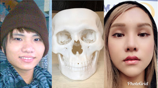 (左)超直白的下巴略短,且稍微後縮 (中)經由電腦斷層比對後發現,下巴骨全平、缺乏弧度 (右)透過骨雕延長後,臉型顯瘦不少
