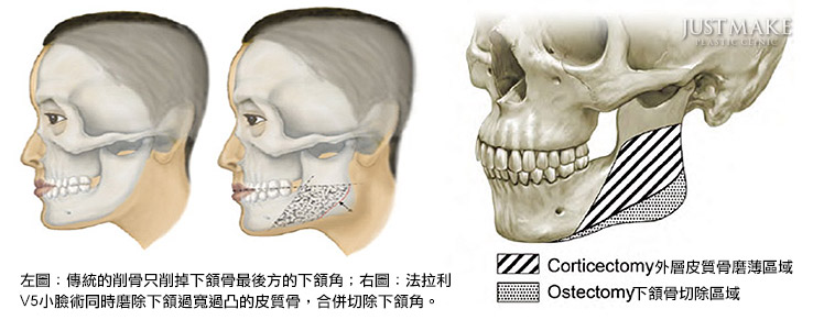 主要針對下頷角(俗稱腮幫子)過於突出、外翻,或下頷骨體本身寬厚的情況。手術透過切除、磨平下頷角及部分下頷骨體,使原本方正、寬闊的下半臉線條變得更纖細柔和,有效改善「國字臉」、「方臉」等問題,打造更精緻的V字下巴曲線。改善下頷骨骨相,使臉部皮相更精緻。