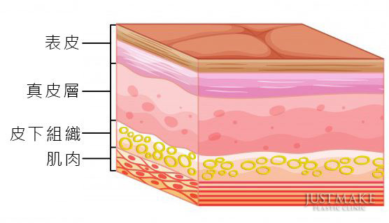 介於肌膚的表皮層與皮下組織之間,真皮層主要負責肌膚的組織支撐,可維持肌膚彈性的膠原蛋白等細胞所組成。