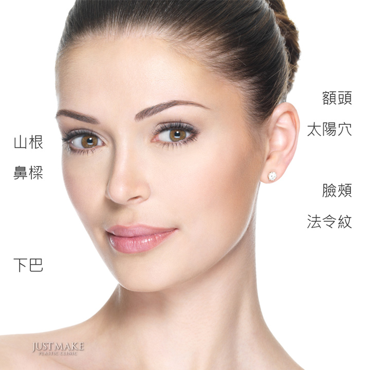 - 填補於法令紋、太陽穴的凹陷處,額頭、臉頰部位,增加澎潤感。