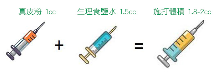 異體真皮粉需與生理食鹽水調和後注入填充處,大約10天左右生理食鹽水會隨身體代謝掉。60~90天後,異體真皮粉吸收後大約會剩一半的體積。醫師建議2~3次施打填充才能達到理想效果,補針需間隔三個月。