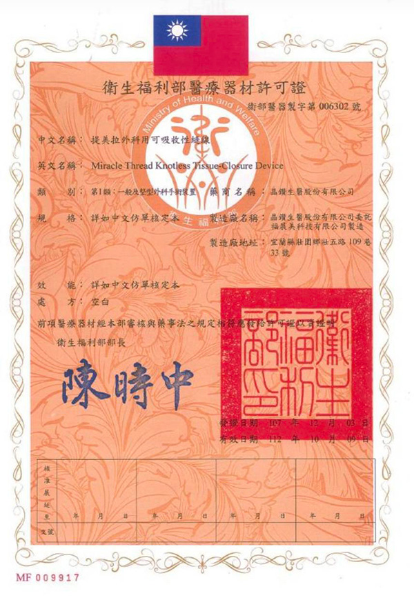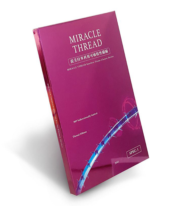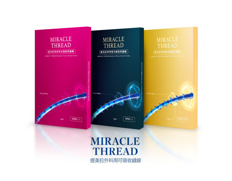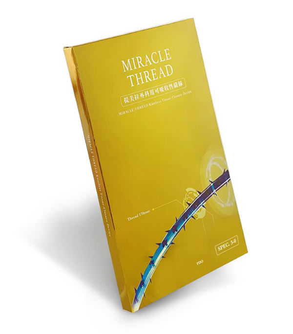 提美拉外科用可吸收縫線 Miracle Thread Knotless Tissue-Closure Device,是一種單股可吸收合成(聚對二氧環已酮)外科縫合線,採用比利時可吸收 PDO 縫線(Polydioxanone)製成。一體成型,具有 360 度雙向倒鉤縫合線,適用於線性拉提療程。提美拉是由皮膚專科醫師發明,獲得國際專利認可,台灣 TFDA 核准合法線材。也通過細胞毒性檢測,具有良好的生物相容性,給您安心安全的療程。