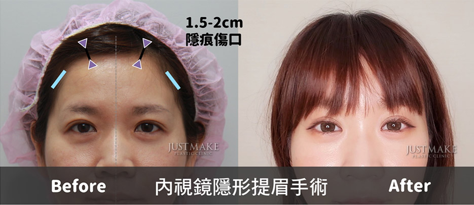 手術進行方式會先在前額髮際處,開四個約1.5-2公分左右的隱痕切口,手術過程運用內視鏡技術,視野清晰能精準放大,分辨臉部精細的組織結構,配合專用手術器械進行剝離,將下垂組織拉提回適當的位置,可 以改 善眉 眼距 離過 近、眉眼下垂、額 頭凹 陷短 小、雙眼 皮垂 墜…等問題。